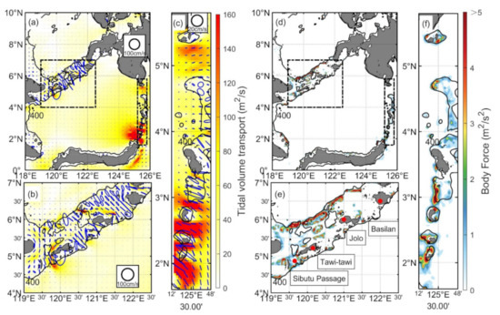 where H presents the basin depth, ∇H is the bottom gradient, Q is the barotropic tidal volume transport from TPXO, ω is the M2 tidal frequency, and N2 is the buoyancy frequency calculated from stratification from WOA2018. Figure 7d shows the barotropic tidal body force in the Sulu-Sulawesi Seas. In particular, Sibutu Passage, near Tawi-tawi Island, and Jolo Island, along the Sulu Island chain, are strong sources (Figure 7e). The body force shows that the generation sites are on the northern and southern sections of the Sangihe Island chain (Figure 7f). It reveals that strong conversion sites are scattered around the two island chains, which is consistent with previous work [43].