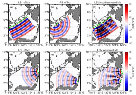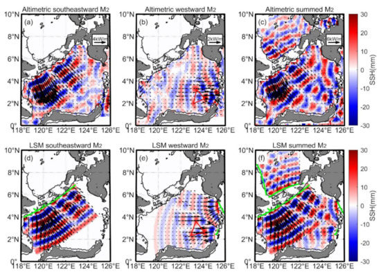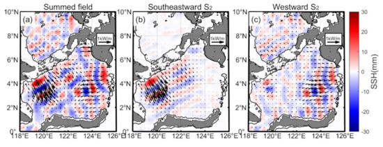 Figure 10a shows the superposition map of mode-1 S2 internal tides. Consistent with the M2 internal tide field, the Sulu and Sangihe Island chains are also essential generation sources for the S2 internal tides. Several internal tidal beams are shaped by multiwave interference. Then, we separated the southward and westward components, respectively. Figure 10b shows the S2 internal tidal beams propagated from the Sulu Island chain into the Sulawesi Sea. They propagate about three wavelengths and become undetected by satellite altimeters. The western internal beam is stronger than the eastern one, which indicates that the Sibutu Passage is also an energetic generation site. The SSH ratio of S2 to M2 is 0.46, consistent with their ratio in the global ocean [48]. However, differently from M2 internal tides, we find the lack of a stable and continuous eastward S2 internal tide signal. We deduce that the eastward S2 internal tide is very weak and becomes undetectable.