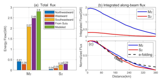 In this section, we estimate the semidiurnal internal tidal energy fluxes from two island chains. The total energy fluxes are integrated along a section across the whole sea basin parallel to the two island chains. For the southeastward M2 internal tide from the Sulu Island chain, we acquire a total energy flux of 2.07 GW. Similarly, we estimate the northwestward energy flux from the Sulu Island chain and westward energy flux from the Sangihe Island chain. The total energy fluxes for the northwestward and westward internal tides are 0.41 and 0.28 GW, respectively. Thus, the total M2 tidal energy flux from the Sulu Island chain is 2.48 GW (Figure 12a). It is about 80% of 2.8 GW from the numerical simulation by Nagai and Hibiya [27]. The westward internal tide is smaller than the model result because only the energy flux in the Sulawesi Sea is considered [51]. Likewise, the energy flux for each direction of the S2 internal tides is estimated. The energy fluxes for the northwestward, westward, and southeastward internal tides are 0.04, 0.09, and 0.25 GW, respectively. The total semidiurnal tidal energy fluxes from the Sulu and Sangihe Island chains into the Sulawesi Sea are about 2.7 GW, measured by satellite altimetry.