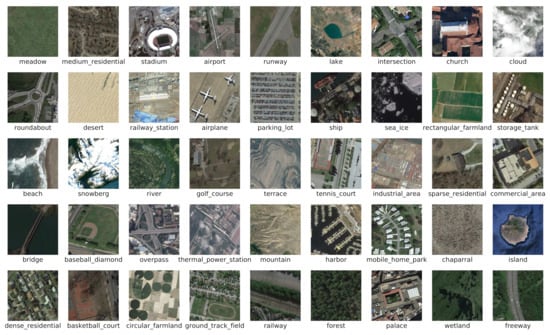 The NWPU-RESISC45 dataset [20] contains 31,500 remote sensing scene images with 45 scene classes, and each class consists of 700 aerial images as shown in Figure 5. The size of all images is pixels in the RGB color space. These 45 scene classes are randomly split into 23, 11 and 11, respectively. Classes of the test set are basketball court, church, dense residential, golf course, intersection, medium residential, palace, rectangular farmland, sea ice, stadium and thermal power station. This is the largest publicly available dataset in the remote sensing scene classification task.