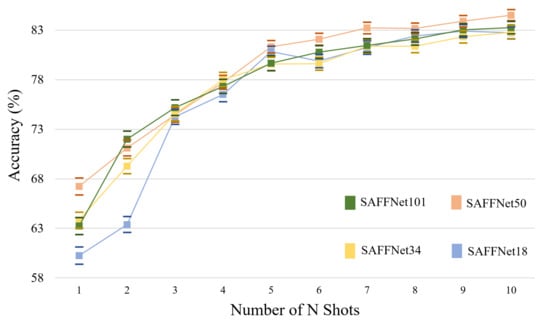 The influence of training “shots” on classification accuracies conducted on the NWPU dataset by the proposed SAFFNet based on each ResNet Network, denoted as SAFFNet101, SAFFNet50, SAFFNet34 and SAFFNet18 in 5-way K-shot tasks when , respectively.