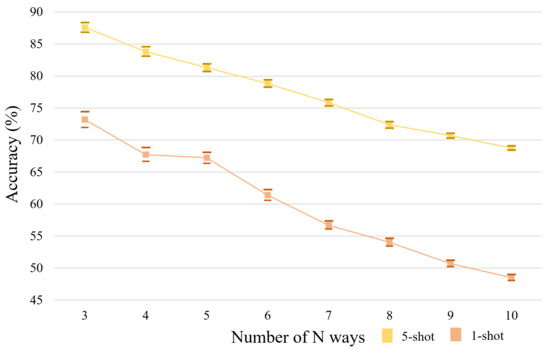 The influence of given “ways” N on classification accuracies by the proposed SAFFNet model based on the ResNet50, in the N-way 1-shot and 5-shot tasks when , respectively.