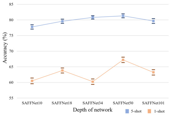 To further validate the effectiveness of the proposed method, four different backbone networks were exploited for further comparison as shown in Table 8. Here, the backbone networks are based on ResNet 101, 50, 34 and 18, respectively. The experimental results show that the proposed SAFFNet can significantly increase both few-shot classification accuracies and robustness in both the 5-way 5-shot task and 5-way 1-shot task in all datasets compared with the backbone models without feature fusion.