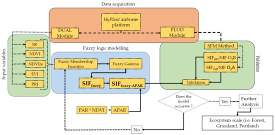 Therefore, following Bandopadhyay et al. [1], we have developed an integrated fuzzy logic modelling technique to build a stepwise approximation of potential SIF from simple reflectance-based SVIs that have a high agreement with SIF760 and SIF687 retrieved from airborne data. To achieve the best replica of SIF from the integrated fuzzy model and test whether the inclusion of APAR makes the model more accurate, we adopted two different approaches: 1) direct assimilation of SVIs into the fuzzy logic model termed as SIFfuzzy, 2) injection of APAR into the SVIs-based fuzzy logic modelled outputs termed as SIFfuzzy-APAR. Furthermore, SIFfuzzy and SIFfuzzy-APAR were validated based on the HyPlant-derived actual SIF data at both oxygen absorption bands. We hypothesized that the modelled proxies of SIF will capture the structural and functional traits of diverse vegetation groups and are in strong agreement with actual SIF signals. Further, we also hypothesized that the inclusion of APAR into SIFfuzzy-APAR model will increase the model accuracy. We believe that the proposed method might be applicable for ground, UAV, airborne as well as spaceborne-based observations for both homogenous and heterogeneous ecosystems.