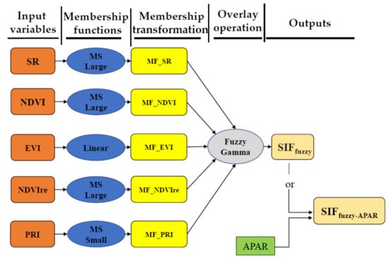 Finally, the Fuzzy Gamma operation has been conducted through the combining of membership maps of the SR, NDVI, EVI, NDVIre, and PRI (i.e., MF_SR; MF_NDVI; MF_EVI; MF_NDVIre; MF_PRI) to get the final output of the simulation, showed in the overall schema (Figure 4). Parallelly, another modelled output has been produced with the injection of APAR into the modelled data.