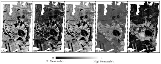 Membership maps of the different SVIs: (A) MF_NDVI; (B) MF_SR; (C) MF_NDVIre; (D) MF_EVI and (E) MF_PRI, derived from the fuzzy membership transformation functions. The membership maps ranging from 0 to 1 represent no membership to high membership, respectively.
