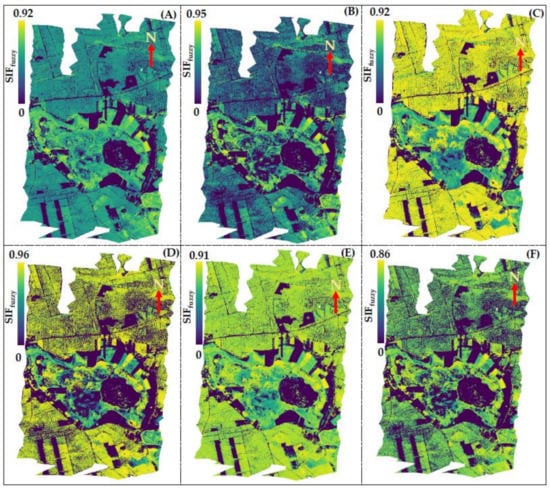 Hence, it has been evident and recommended that the utilization of SIFfuzzy under models C3 and C4 for SIF760 and C6 for SIF687 or SIFfuzzy-APAR under C6 for both SIF760 and SIF687 would be the optimum solution to develop the proxy of potential SIF signals at 760 nm and 687 nm with high accuracy. The study also showed that EVI and NDVI, which can be available from spaceborne products, can be used to approximate the SIF signals to some extent. Although this study employed one-day airborne campaign data, the outcome of this study demonstrated a promising method to develop a proxy of potential SIF, where and when SIF data are not easily available or under data constraint situations. Though the proposed method does not have a significant impact on the change of observation day, slight changes in the agreements may occur during seasonal changes and atmospheric anomalies.
