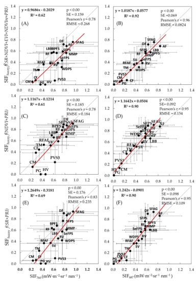 Scatterplots of the best performing fuzzy logic model outputs (SIFfuzzy) and actual SIFs (SIF760 and SIF687) were determined based on HyPlant airborne data. (A,B) SIFfuzzy expressed by f(NDVI+EVI+NDVIre+SR+PRI) under model C6; (C,D) SIFfuzzy expressed by f(NDVI+PRI) under model C3; (E,F) SIFfuzzy expressed by f(SR+PRI) under model C4. Standard deviations are represented in error bars. The letter abbreviations correspond to the codes of vegetation groups presented in Figure 2.