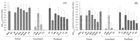 Example of bar diagrams representing the modelled values of SIFfuzzy obtained from 19 ROIs; (A) SIFfuzzy as expressed by f(NDVI+PRI) under C3; (B) SIFfuzzy as expressed by f(NDVI+EVI+NDVIre+SR+PRI) under C6. Error bars represent the standard deviations.