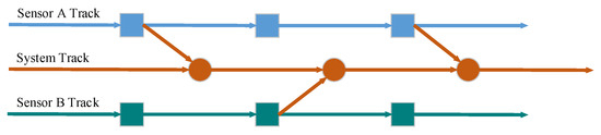 Distributed fusion structure is a typical fusion structure in track fusion and has two typical track fusion structures [49]. One track fusion structure is the sensor to sensor, and the other track fusion structure is the sensor to system [50]. The track fusion structure of the sensor to system is shown in Figure 1. During the process of generating the system track by track fusion, not only the track information of sensor A but also the track information of sensor B is applied. In the process of fusion, the known prior conditions are fully utilized to improve the accuracy of fusion track as much as possible [51].