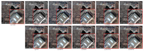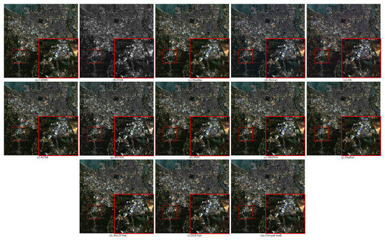 Area 4 is the partial images of Haikou City, Hainan Province acquired by the GF-2 satellite sensors on 9 December 2016, as shown in Figure 10g,h. Figure 10g is the MS image with a spatial resolution of 4 m and pixel size of 785 × 822. Figure 10h is the corresponding PAN image with a resolution of 1 m and pixel size of 3140 × 3288. According to Wald’s criterion, the PAN and MS images are downsampled by a factor of 4 to obtain 4 m PAN and 16 m MS simulation images, respectively. We simulated 45 testing image pairs for GF-2.