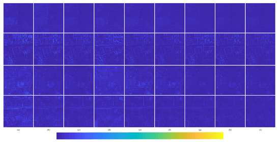 Area 3 is a part of image pairs of Haikou City, Hainan Province, near the South China Sea, acquired by the Landsat-7 satellite on 8 November 2000, as shown in Figure 10e,f. Figure 10e is the MS image with a spatial resolution of 30 m and pixel size 600 × 600. Figure 10f is the corresponding PAN image with a spatial resolution of 15 m and pixel size 1200 × 1200. According to Wald’s criterion, the PAN and MS images are downsampled by a factor of 2 to obtain 30 m PAN and 60 m MS simulation images, respectively. We simulated 50 testing image pairs for Landsat-7.