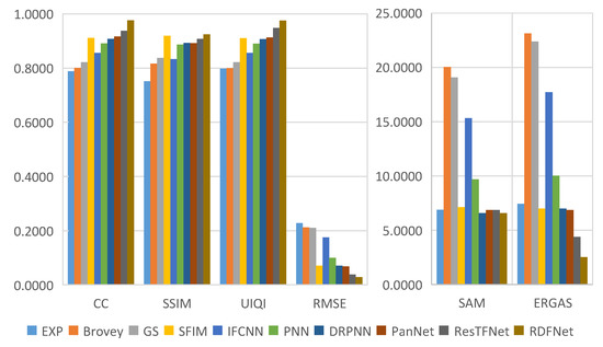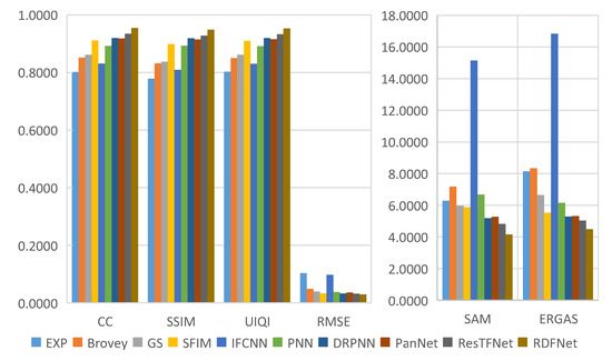 The final fusion results are evaluated by subjective visual perception and objective metrics. Subjective visual perception evaluation is used to compare the fusion result, reference image, and the original image with human vision and observe the clarity, color, outline, and some details, then to judge whether the fusion effect is good or bad. Subjective visual perception evaluation will vary from person to person, and can only represent the judgment results of certain people, which is somewhat one-sided. A reliable, quantitative, and objective quality metric is also needed to further analyze the fusion results to determine the fusion effect. Among them, the following objective quality indicators are mainly used to evaluate the fusion results, which can be divided into full-reference and no-reference indicators. The full-reference indexes we use include correlation coefficient () [56], Root Mean Square Error () [59], Structural similarity () [60], Spectral angle mapping () [61], Erreur Relative Globale Adimensionnelle de Synthése () [14], and universal image quality index () [62]. The no-reference indexes we use consist of , , [63].