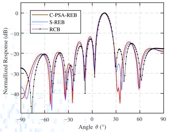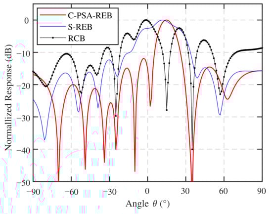 In Figure 4, , the curvilinear trajectory is parallel to the signal incident plane. S-REB barely steers the main-beam towards the actual incident angle of SOI, and it cannot form nulls at the direction of two interferences either. Due to severe SV mismatch caused by curvilinear trajectory, RCB fails to steer main-beam, and forms nulls at the direction of SOI, which will lead to “self-cancelation”. Compared to S-REB and RCB, the proposed C-PSA-REB forms two deep nulls precisely around interferences. Moreover, C-PSA-REB can keep the beam response distortionless.