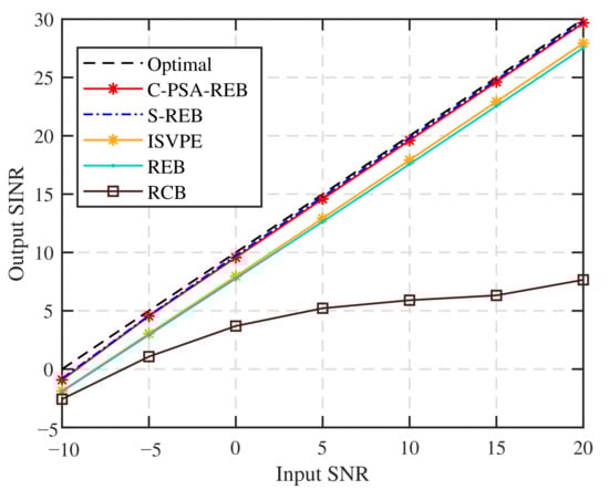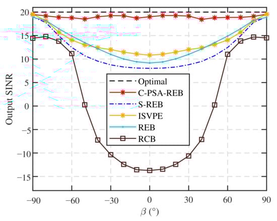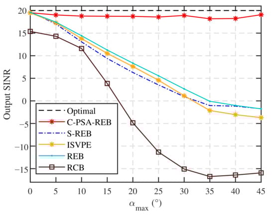 Figure 6 demonstrate the output SINR versus different upper boundary . When increases, the performance of RCB dramatically decreases, and finally stays around −17 dB, which indicates the existence of “self-cancelation”. REB, S-REB and ISVPE perform similarly, their performance degrades severely when increases. When , their SINRs are all bellow 0 dB.