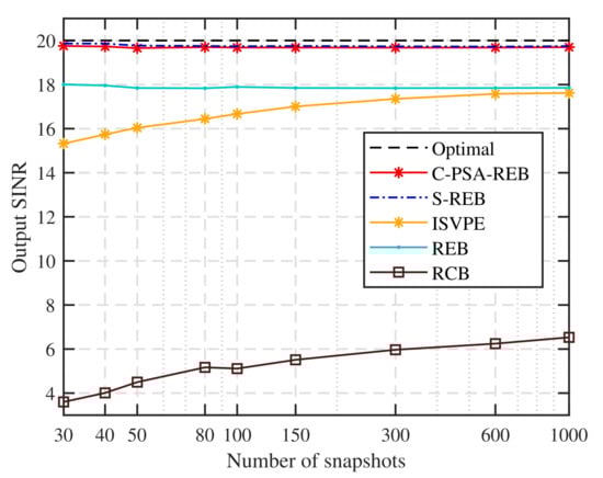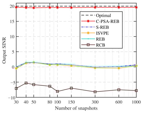 We have simulated that when there are incoherent local scattering signals, the output SINR of each beamformer varies with the input SNR, and it is shown in the Figure 9. It can be seen that all reconstructed beamformers can perform well. By suppressing interference and noise, the algorithm proposed in this paper can be reach the optimal value just like S-REB. Due to the presence of local scattering signals, the RCB algorithm must deal with SV mismatches, which reduces the RCB’s performance to only 22 dB when input SNR is 20 dB. Then, we simulated the impact of the number of snapshots on performance and showed it in the Figure 10, similar to Figure 8, REB, S-REB and C-PSA-REB are all insensitive to the variation snapshot number, and the proposed C-PSA-REB can achieve 19.5 dB even in small snapshots.