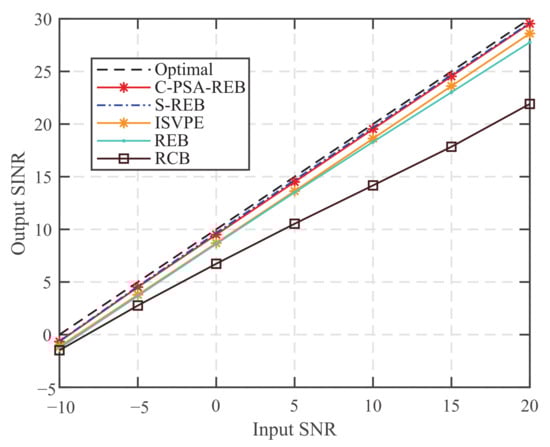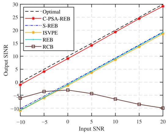 Since the curvilinear trajectory is modeled and the non-orthogonal basis of the signal subspace is estimated by the joint optimization method, the proposed C-PSA-REB performs robustly with different , and the output SINR remains at about 19 dB even when .