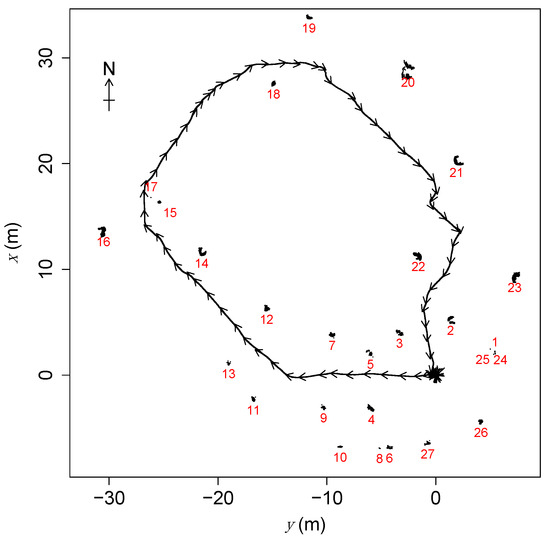 Map showing horizontal cross-section of plot with SLAM trajectory (curve, with arrows showing direction of UAV, starting and ending at ) and clusters of transformed and collated LiDAR scan points (indicated by sequence numbers in red).