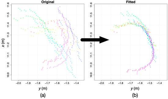 An example cluster illustrating the action of the scan-matching algorithm (minimization of length of minimal spanning tree—see main text). (a) The input to the algorithm comprised 16 horizontal LiDAR scans (each color designates one scan) for cluster 22 (see Figure 2), transformed and collated using the SLAM trajectory for the UAV; (b) the output from the algorithm comprised the same 16 scans but with their and positions adjusted.