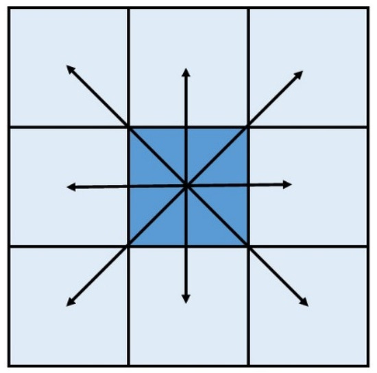 k = 1 when Zi is in the east–west or north–south direction, k = 1√2 when Zi is in the diagonal direction, and it is assumed that the flow of the central cell Zc flows to all Zi, that is, the flow of the central cell flows to all the neighbor cells in the steepest direction. Each time the flow of the central cell can only flow in one direction of the neighboring cells; when there are multiple neighboring cells with equal weight difference, a direction is randomly selected as the flow direction. Figure 1 is the flow direction diagram of the central cell.