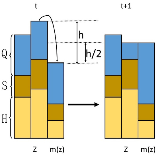 where, Hz is the center cell height, mm; Sz is the center cellular sediment height, mm; Qz is the water depth of the center cell, mm; Hm (z) represents the elevation of the neighbor cell with the smallest water head, mm; Sm(z) represents the sediment height of the neighbor cell with the smallest head of water; and Qm(z) represents the water depth of the neighbor cell with the smallest head, mm.