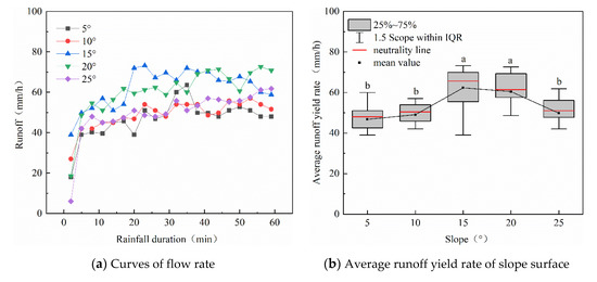 Figure 3 shows that in the early stage of rainfall, most of the raindrops that fell on the slope surface infiltrated into the soil through the soil pores and transformed into soil moisture. Therefore, the degree of aggregation of rainwater on the slope surface was weak and the runoff rate was less. With the progress of the rainfall, the soil was gradually saturated with moisture, and the soil moisture infiltration capacity gradually weakened. The infiltration and runoff process reached a relative balance, and the runoff yield began to stabilize. When the slope increased from 5° to 15°, the average flow rate increased, and when it continued to increase, the average flow rate began to decrease. Therefore, when the slope ranges from 15° to 20°, there may be a critical value, and for the slope in the critical state, the average runoff yield reaches a high level.