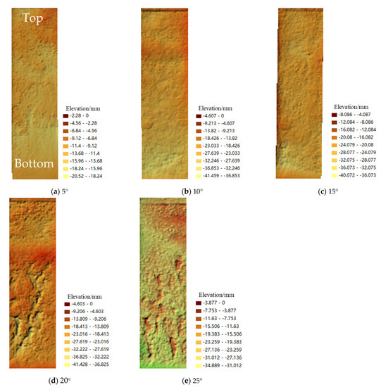 (1) Through the analysis of slope erosion morphology after rainfall, it was confirmed that with increases in slope gradient, the surface area and average erosion depth of the area with serious slope erosion gradually increased, the flow conditions were enhanced, and the fulcrums of flow convergence gradually increased. Fish scale-shaped eroded areas such as ridges and pits begin to appear in different regions of the slope.