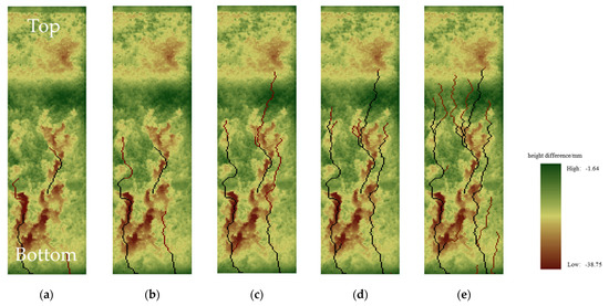 Taking the 20° slope as an example, we studied the confluence path development process. The confluence accumulation was calculated based on the flow direction data. By setting different thresholds, the confluence paths of different confluence accumulations could be extracted. The flow tended to converge from the high to the low, so the closer to the bottom of the slope, the greater the cumulative flow, and the higher the degree of convergence. Setting different cascading cumulative flows from large to small could reflect the derivation and development of the confluence path. Slope runoff was the main driving force of rainfall erosion. The larger the accumulated confluence, the more serious the erosion became, and it was easier to form slope topography such as fall ridges, which provide a universal indication that the development of a confluence path can reflect the development of erosion. First of all, it can be seen in Figure 7a that the flow with a large accumulated confluence mainly occurred near the bottom of the slope, the erosion around the confluence path was relatively serious, and the erosion depth was mostly above 25 mm. The gully erosion at the bottom of the slope was affected by runoff erosion. The channel terrain was relatively low, and the flow easily sank and converged here, which made the accumulated confluence larger. The confluence path in Figure 7b began to show the trend of traceability, extending along the area with deep erosion to the middle of the slope, and extending from the slope area with erosion depth of about 25 mm to the slope area with an erosion depth of about 18 mm. It can be seen from Figure 7c that the confluence path on the slope had developed three water flows with certain conditions, and the water flow further extended to the top of the slope, and there was a trend of bifurcation to form tributaries. It can be seen from Figure 7d that the branched tributaries also began to gradually extend, and the flow length increased, slowly covering the slope area with an erosion depth of about 10 mm. The confluence path in Figure 7e was fully developed. It can be seen that the distribution of the river network on the slope surface was roughly shown. The closer to the top of the slope, the denser the tributaries covered and extended to the area where the erosion was not very deep. Slope erosion is a process of retrogressive erosion, which gradually extends from the bottom of the slope to the top, and gradually develops from the dropper to the lower gully head and then to the shallow gully. Similarly to the evolution and development of erosion, the confluence path extends from the bottom of the slope to the top of the slope, and extends from the slope area with serious erosion to the slope area with small erosion depth. Therefore, by drawing the confluence path of water flow (the black paths in the figure represent the main sink paths, and the red paths represent the branch sink paths), we could roughly predict the trend of erosion occurrence and development, and thus concluded that the erosion caused by rainfall on the slope is a process of steady development and continuous strengthening.