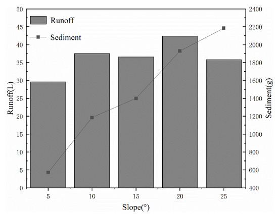 It can be seen from Figure 8, with increases in gradient, runoff increases first and then decreases. The runoff reaches a maximum at 20°, and then begins to decrease as the slope gradient continues to increase. The runoff on the slope is affected by gravity and rainfall. When the slope gradient is small, gravity plays a leading role. The greater the slope gradient, the less rain landing on the slope is converted into infiltration water. Under the action of gravity, the water more easily converges on the slope to form runoff, and the runoff increases. When the slope gradient is large, rainfall plays a leading role. The increase in gradient causes the rainfall area on the slope to decrease, the rainfall that falls on the slope under the same rainfall intensity decreases, and the runoff decreases.