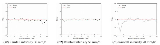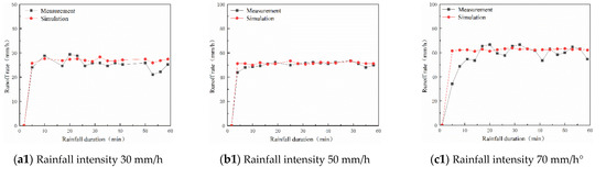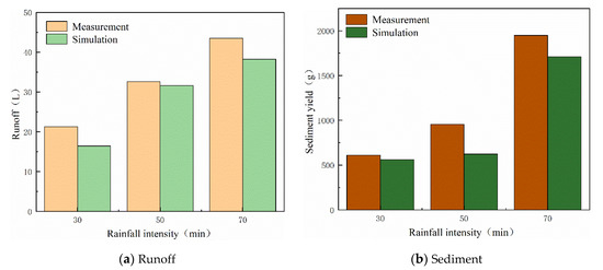 It can be seen from Figure 11a that under different rainfall intensities, the simulation values were smaller than the experimental values, and the error coefficient was between 5.6% and 22.6%. Among them, the model yielded the best simulation effect on runoff under 50 mm/h rainfall intensity, and the error coefficient was 5.6%. As the rainfall intensity continues to increase, the error coefficient increased to 12.1%. The possible explanation is that the increase in rainfall intensity intensified the turbulence of runoff, resulting in more runoff. In the actual rainfall process, raindrops have a disturbance effect on runoff. The raindrop strike will accelerate the formation of crust on the slope, and the surface soil becomes relatively dense, which delays water infiltration on the slope, and rainfall is more likely to converge on the slope to form runoff. Crust formation affects soil erosion by raindrop-impacted flow through changing particle size and cohesion between particles on the soil surface, as well as surface microtopography. Therefore, changes in soil microtopography can, in theory, be employed as a proxy to reflect the complex and dynamic interactions between crust formation and erosion caused by raindrop-impacted flow. However, there are no qualitative explanations for the small changes in soil topography [31]. The model cannot simulate the influence of raindrop impact on the infiltration capacity caused by the formation of crust on the slope surface, so the simulated runoff is less than the experimental value, and the error coefficient increases. From Figure 9(b1,b2), under different rainfall intensities, the error coefficients were between 8.1% and 32.4%, and the experimental values were greater than the simulation values. It should be noted that under the continuous impact of raindrops, soil will be disturbed and soil particles become loose and are more easily separated and transported, so that the amount of erosion shows some difference. In general, the model can effectively predict the amount of runoff erosion on the slope under each rainfall, roughly predict the degree of erosion damage on the slope, and provide support for further erosion prevention and control work.