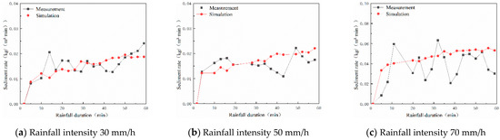 Comparison between measured and simulated sediment rates under different rainfall intensities.