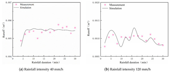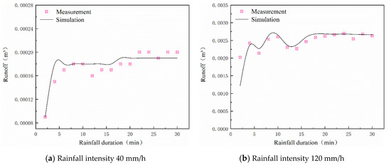 Comparison between measured and simulated runoff rates under different rainfall intensities.