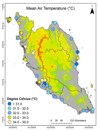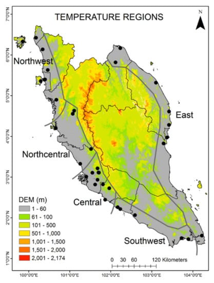 Peninsular Malaysia or also known as West Malaysia is located at the south end of Asia continental plate (Figure 1). It is geographically located between 1° N and 7° N and 99° E to 105° E. It is characterized by hot and humid tropics with temperature ranging between 23 and 35 °C, daily humidity levels exceeding 80%, and high rainfall and cloud cover throughout the year [35]. The weather characteristic is dependent on two monsoonal wind seasons, i.e., Southwest and Northeast monsoons and elevation. The Southwest monsoon outsets from June to September while the Northeast outsets from November to March, with the latter brings higher rainfall density than the former [35]. The coastal region is characterized by lowland regions, and there is an increase in elevation towards the center of peninsular, where mountain ranges such as the Titiwangsa, Benom and Tahan mountain ranges act as the backbone and separates between the eastern and western part. This geographic condition results in lower temperature towards the center of the peninsular compared to the coastal areas.