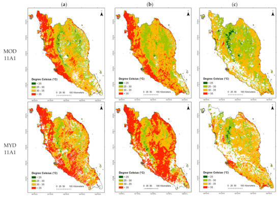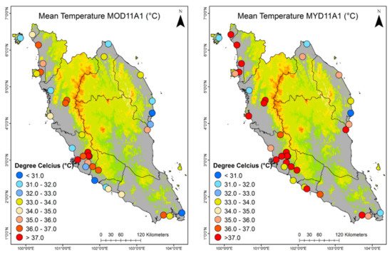 Four MODIS LST products were used in this study: MOD11A1, MOD11A2, MYD11A1, and MYD11A2 with 1 km spatial resolution in a 1200 by 1200 km grid that were obtained from https://search.earthdata.nasa.gov/search (accessed on 2 January 2020). A total of 2 tiles data was used to cover Peninsular Malaysia with horizontal line 27 to 28 and vertical line 08 (H27V08 and H28V08). The data were downloaded from January 2003 until December 2016. The MOD11A1 and MOD11A2 were retrieved from the MODIS sensors onboard Terra satellite with the acquisition day-time at approximately 10:30 a.m. and night-time 10:30 p.m. for daily and 8-days composite data, respectively. Additionally, the MYD11A and MYD11A2 were retrieved from the MODIS sensors onboard Aqua satellite with the acquisition day-time at approximately 1:30 a.m. and 1:30 p.m. for daily and 8-days composite data, respectively.