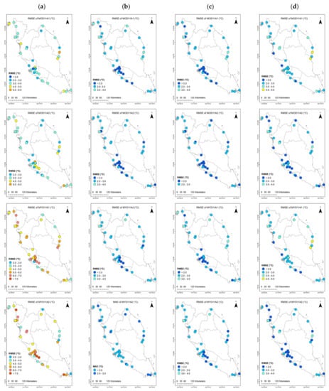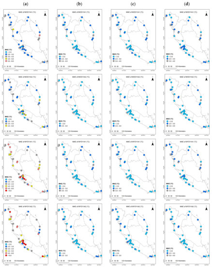 Figure 8 illustrates the spatial MAE distributions, similar to those of the RMSE (Figure 6) values for both pre- and post-MBC. The MAE depicted slightly lower error ranges than the RMSE by 0–1 °C. In particular, for the pre-MBC Ts, MOD11A1/11A2 portrayed low MAE values ranging from 1.46 to 5.20 °C with only 11.11% of the stations showing MAE > 4 °C, while MYD11A1/11A2 revealed slightly higher MAE values ranging from 1.86 to 7.97 °C with 58.33% showing MAE > 4 °C. For MOD11A1, 2 stations exhibited high MAE values > 4 °C, compared to 6 stations for MOD11A2. Meanwhile, MYD11A1 and MYD11A2 data depicted high MAE values > 4 °C with 22 and 20 stations, respectively. Besides, MYD11A1/11A2 showed higher MAE values (>6 °C) for stations located in the west coast (northwest, northcentral, central, and southwest) region, especially the ones that are located in the central region, than those in the east coast.