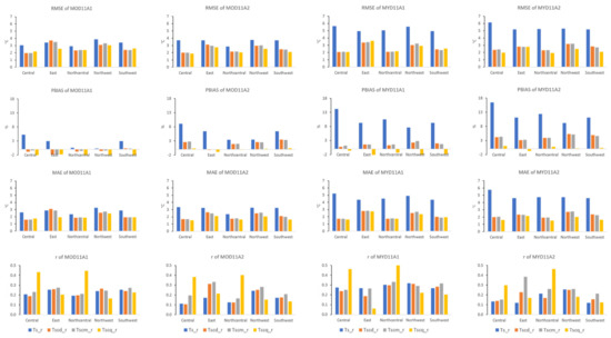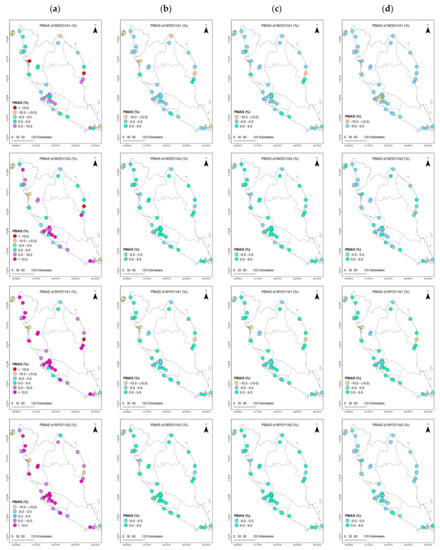 The average PBIAS values for pre-MBC Ts_r was lower for MOD products than those for the MYD products by 2.42%/5.75% and 10.19%/12.07%, respectively (Table 4). The same was observed for maximum and minimum values. The maximum values were recorded at 5.22%/9.06% and 14.21%/16.53% for MOD11A1/11A2 and MYD11A1/11A2 products, respectively, while the minimum values were at 0.29%/3.40% and 7.63%/9.20% for MOD11A1/11A2 and MYD11A1/11A2 products, respectively. The post-MBC products (Tscd_r, Tscm_r, and Tscq_r) tabulated an overall average PBIAS values < 5% with average PBIAS range between −0.75% and 4.30%, −0.62% and 4.26%, and −2.31% and 0.37% for Tscd_r, Tscm_r, and Tscm_r, respectively. Spatially, post-MBC product of MOD11A1 illustrated negative PBIAS values for almost all region (Tscd_r = −1.91% to 0.39%, Tscm_r = −1.93% to 0.30%, and Tscq_r = −2.73% to −1.81%) (Figure 10). Besides, for MYD11A1, the Tscq_r tended to result in negative PBIAS values for all regions with range between −3.18% and −0.61%. Overall, the post-MBC products showed a well reduced bias for MOD11A2, MYD11A1, and MYD11A2.