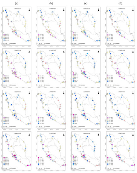 Assessing from Figure 7, for post-MBC (Tscd, Tscm, and Tscq), the daily MOD/MYD11A1 tended to result in more frequent negative PBIAS (Tscd = 31 (86.11%) and 13 (36.11%) stations, Tscm = 28 (77.78%) and 13 (36.11%) stations, and Tscq = 36 (100%) for both products), while the 8-days MOD/MYD11A2 exhibited less frequent negative PBIAS (Tscd = 8 (22.22%) and 5 (13.89%) stations, Tscm = 7 (19.44%) and 5 (13.88%) stations, and Tscq = 25 (69.44%) and 28 (77.78%) stations). Nevertheless, for post-MBC, the majority of the stations exhibited a low range of PBIAS close to zero, between −5% and +5% for the daily MOD/MYD11A1 (Tscd = 31 (86.11%) and 33 (91.67%) stations, Tscm = 35 (97.22%) and 34 (94.44%) stations, and Tscq = 34 (94.44%) and 33 (91.67%) stations) and the 8-days MOD/MYD11A2 with all stations demonstrated 100% PBIAS ranging between −5% and 5%.