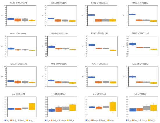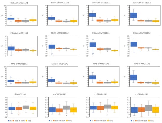 On the contrary, the average RMSE values of all post-MBC products (Tscd, Tscm, and Tscq) depicted lower error range compared to the pre-MBC products (Ts), ranging from 2.11 to 2.39 °C, 2.06 to 2.35 °C, and 2.07 to 2.74 °C for Tscd, Tscm, and Tscq, respectively. For all post-MBC products, the 8-days MOD/MYD11A2 showed lower average RMSE values (Tscd = 2.11 °C/2.32 °C, Tscm = 2.06 °C/2.31 °C, and Tscq = 2.12 °C/2.07 °C) than the daily MOD/MYD11A1 (Tscd = 2.39 °C/2.37 °C, Tscm = 2.35 °C/2.34 °C, and Tscq = 2.74 °C/2.67 °C). Moreover, the same pattern was shown for the maximum RMSE values. The maximum RMSE values for the 8-days MOD/MYD11A2 were recorded lower, i.e., 3.04 °C/3.07 °C, 3.00 °C/3.20 °C, and 3.66 °C/3.57 °C compared to the daily MOD/MYD11A2, i.e., 3.56 °C/3.86 °C, 3.54 °C/3.71 °C, and 4.37 °C/4.34 °C for Tscd, Tscm, and Tscq, respectively.