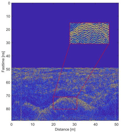 Hyperbolas in the radar image are segmented manually using a simple “draw rectangle” function, creating a slow-time section of the image to focus within. Furthermore, fast-time data outside the rectangular window is set to zero. Although not implemented here, this step can be automated [18].
