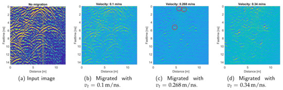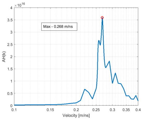 Since the apex of the hyperbolas should have a maximum at the correct propagation velocity, we can look at the average image intensity to evaluate the focusing [29]. For a migrated radar image at test velocity , this parameter can be stated as