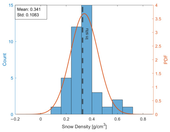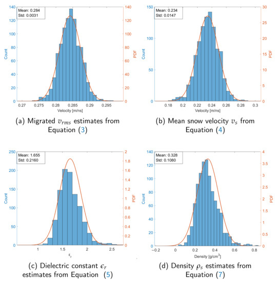 Figure 10 shows the distribution of density estimations from the autofocusing procedure. Figure 6 shows measured snow depth along the 250-m transect for four passes. Identification of the snow–ground interface is described in [26], where we obtained the TWT used in Equation (6). Snow depth is then calculated using the TWT and the estimated propagation velocity of the snow.