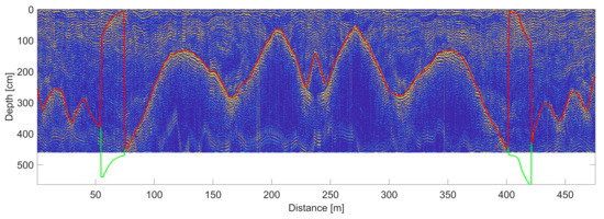B-scan radar image of one pass back and forth across the transect. Red line indicates the snow–ground interface and green line indicates the snow–ground interface detected in the second signal period, with range ambiguity (i.e., deeper than ≈460 cm for ).