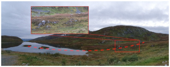 Transect containing rocky parts after melt season. Dotted lines indicate the transect. The cropped-out section show the rocky area where diffraction hyperbolas were found.