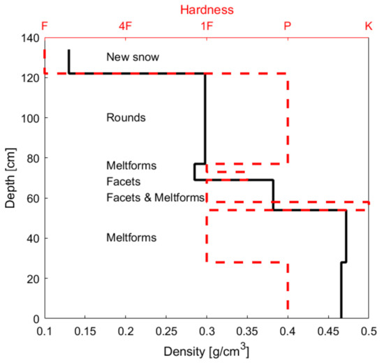 Vertical profile of in situ snow density (black), hardness (red dashed line), and grain type (annotations).