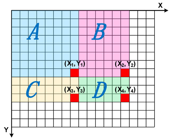 Suppose that parameter (see Figure 6) and parameter (the value of t is greater than 0 and less than 1) represents the background radius and the segmentation coefficient, respectively; then, the sum of pixel gray values in the rectangular area with as the center and as the side length is determined by Equation (18).