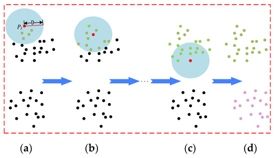 - Start a new clustering by repeating steps (1)–(3) from the remaining points in P until all points are handled, as shown in Figure 7d.