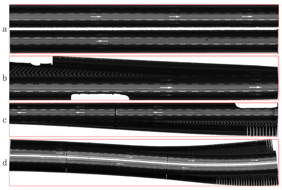 Four sections of roads A1, A2, A3 and A4 (see Figure 11) were selected from the original road point clouds as the test areas, with each section having a length of approximately 160 m. Following the method described in Section 2.1, the pavement point clouds are extracted from the four original road point clouds and then transformed into raster images. We tried different values of the parameter in Equation (15) and found that the best result can be obtained when parameter equals 3. The point interval among the point clouds is about 0.015 m in our experiment, the pixel resolution of the rasterization image is set to 0.05 m, i.e., . In order to avoid pixel holds to the greatest extent, the interpolation radius is set to 0.15 m, i.e., . Figure 14 shows a schematic diagram of the four sections of pavement point clouds for A2, A3, A4 and A1 converted into raster images.