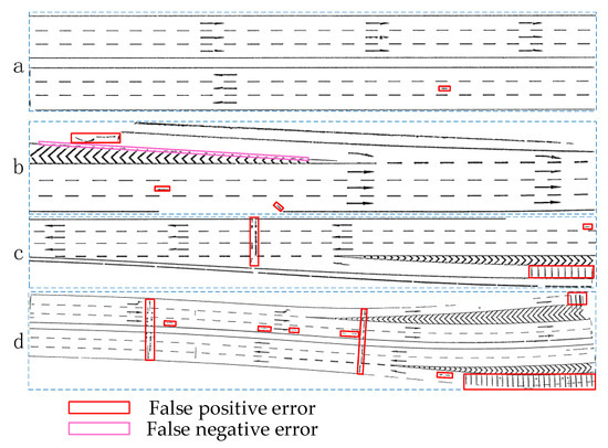 In Figure 15 (Section 4.3), false positive error means that some road pavement point clouds are wrongly marked as road marking point clouds. The reason for this may be that the point cloud intensity value in the wear area is high due to the pavement wear. The false negative error represents a defect in the road marking point clouds, which may be caused by the blocking of vehicles during data collection. This deficiency can be remedied by scanning the pavement again.