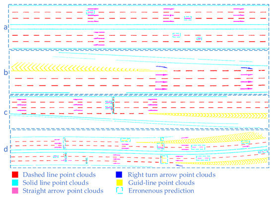 The deep learning network PointNet++ is applied on the remaining clusters. The number of dashed lines with labels included in the training data is 2060, and the number of guidelines, straight arrows, left turn arrows and right turn arrows included in the training data is 2045, 2045, 2045 and 2045, respectively. These training data are labeled with corresponding labels. The total number of labeled road markings used for training is 10,240. They are fed into the classification module of PointNet++ for training. The testing data contain 412 dashed lines with labels, and the number of guidelines, straight arrows, left turn arrows and right turn arrows included in the testing data is 409, 409, 409 and 409, respectively. These testing data are also labeled with corresponding labels. The total number of road markings used for testing is 4096. Another four areas of unlabeled road markings are used as prediction data. The semantic recognition result is shown in Figure 17. The identified dashed lines are marked in red. The identified solid lines are marked in cyan. The identified guidelines are marked in yellow. The identified right turn arrows are marked in blue. The identified straight arrows are marked in pink. Road markings that are misclassified are surrounded by cyan boxes. In this paper, the road marking identification results are evaluated using the precision, recall and F-score. Quantitative test results are shown in Table 3.