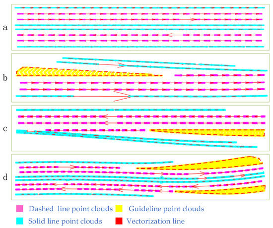 Section 2.3 depicts the process of vectorization of road markings for dashed lines. In fact, the solid lines can be divided into numerous dashed line clusters. Therefore, the vectorization of solid line clusters is similar to the vectorization of the dashed lines. The empirical values of the search angle, search distance and similarity are given first (in Section 2.3) and then updated according to the partial sample data. The alpha shape algorithm is used to vectorize the guidelines. As shown in Figure 18, all dashed lines, solid lines and guidelines correctly identified in the previous section are correctly vectorized.